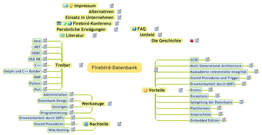 FAQ Umfeld Die Geschichte Vorteile ACID Multi-Generational Architecture Kaskadierte referentielle Integrität Stored Procedures und Trigger Erweiterbarkeit durch UDFs Events Exceptions Spiegelung der Datenbasis Plattformen Anspruchslos Embedded Edition Nachteile Erweiterbarkeit durch UDFs Stored Procedures Web-Hosting Werkzeuge Administration Datenbank-Design Sonstiges Programmierung Treiber Java .NET ODBC OLE DB C++ Delphi und C++ Builder PHP Python Perl Literatur Persönliche Erwägungen Firebird-Konferenz Einsatz in Unternehmen Alternativen Impressum